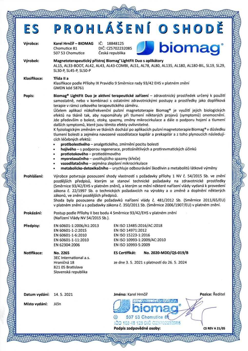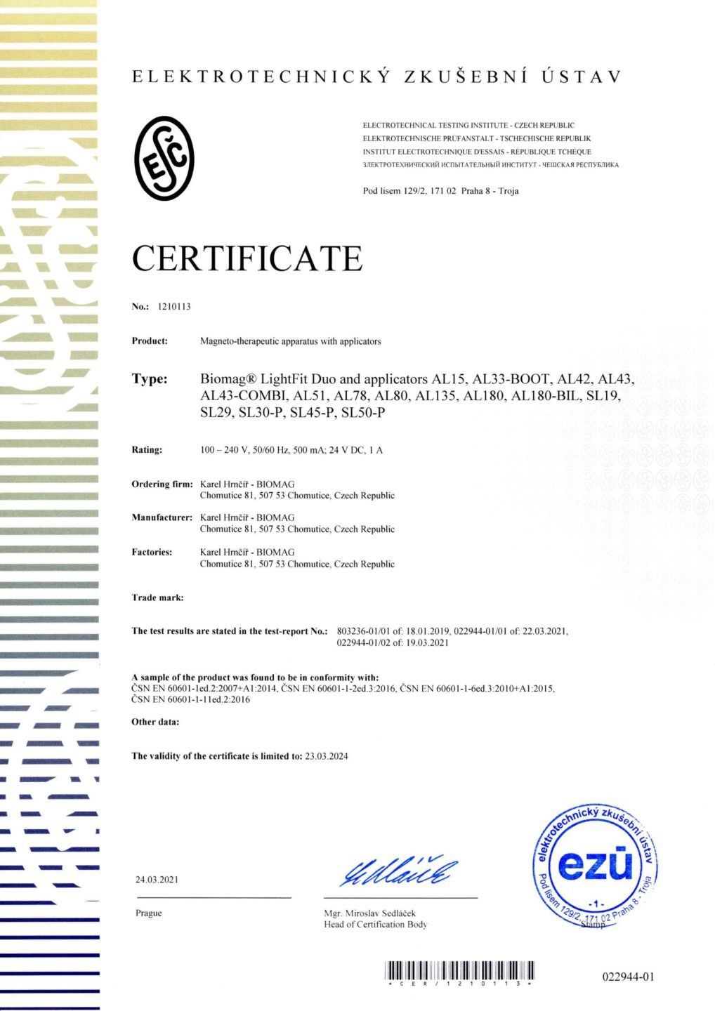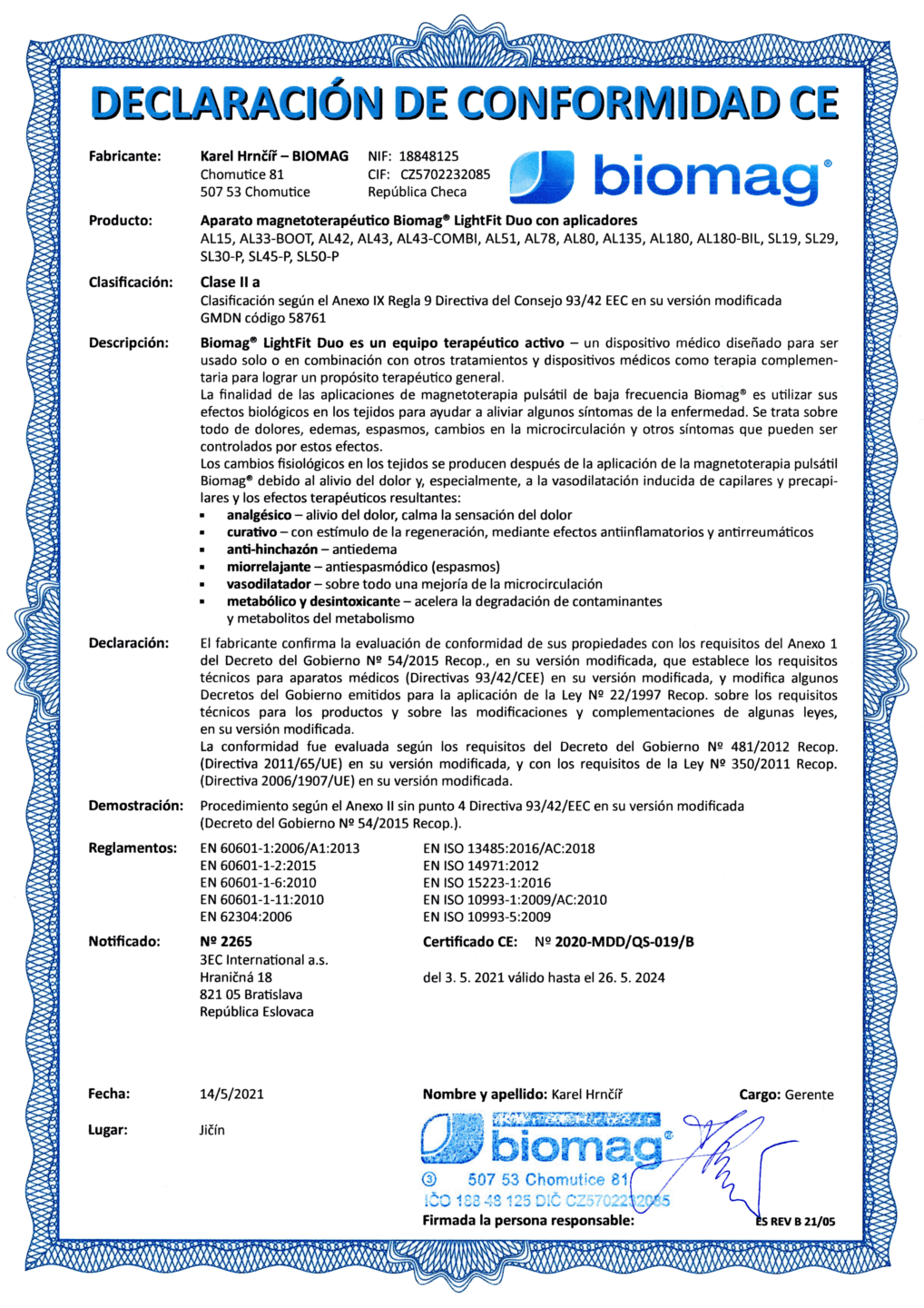 El certificado emitido por el Instituto de Ensayos Electrotécnicos confirma que fue emitido sobre la base del cumplimiento de los requisitos del esquema de certificación y declara que el dispositivo médico BIOMAG® cumple con los requisitos de las normas aplicables para la seguridad de los dispositivos médicos.