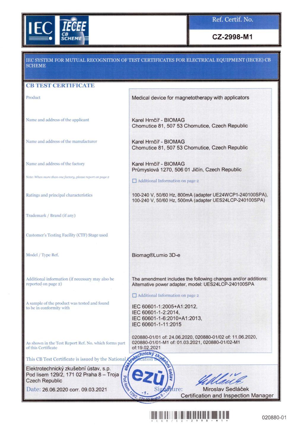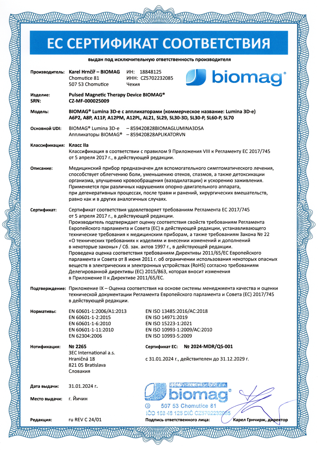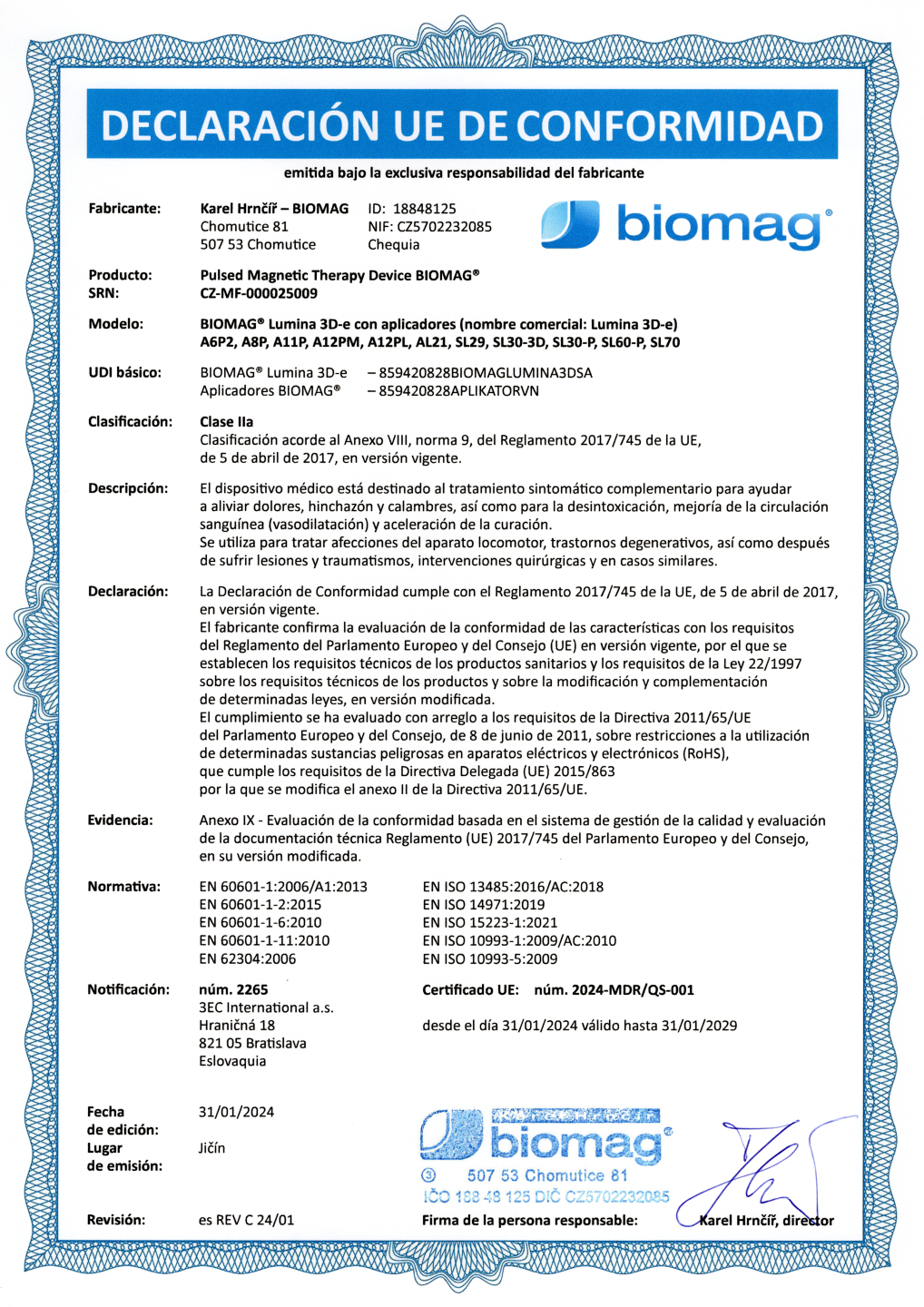 El certificado emitido por el Instituto de Ensayos Electrotécnicos confirma que fue emitido sobre la base del cumplimiento de los requisitos del esquema de certificación y declara que el dispositivo médico BIOMAG® cumple con los requisitos de las normas aplicables para la seguridad de los dispositivos médicos.
