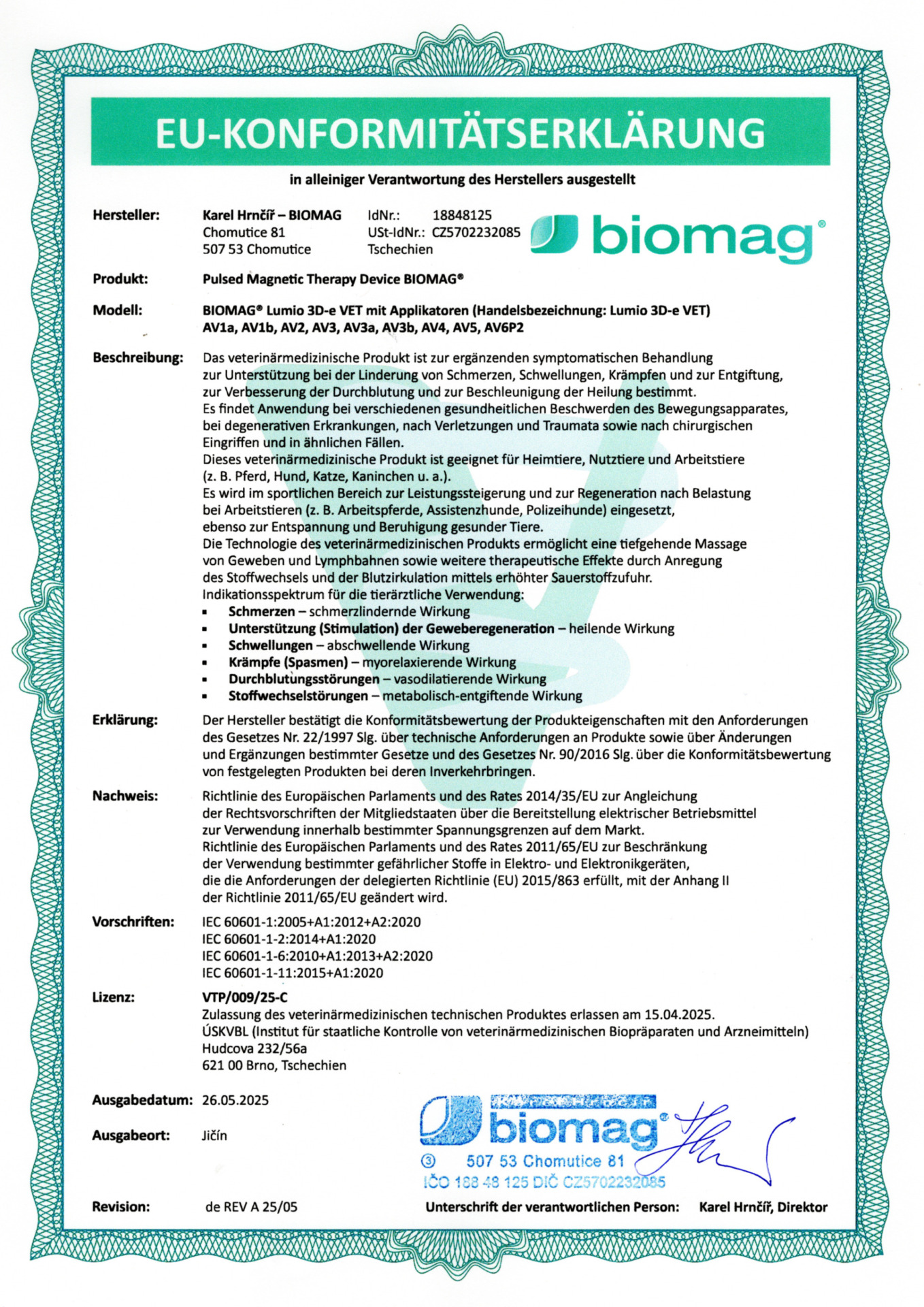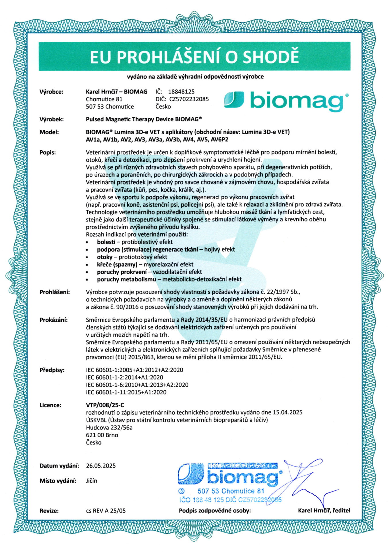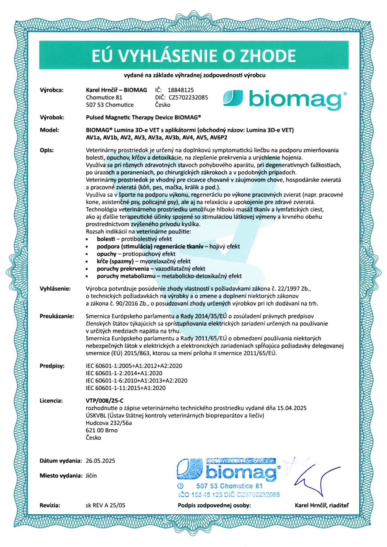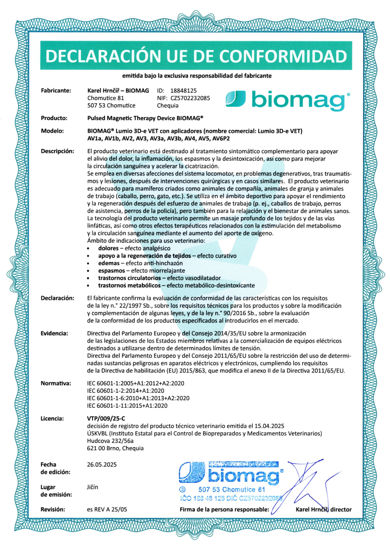 Certificado veterinario - BIOMAG® Lumina 3D-e VET, Lumio 3D-e VET