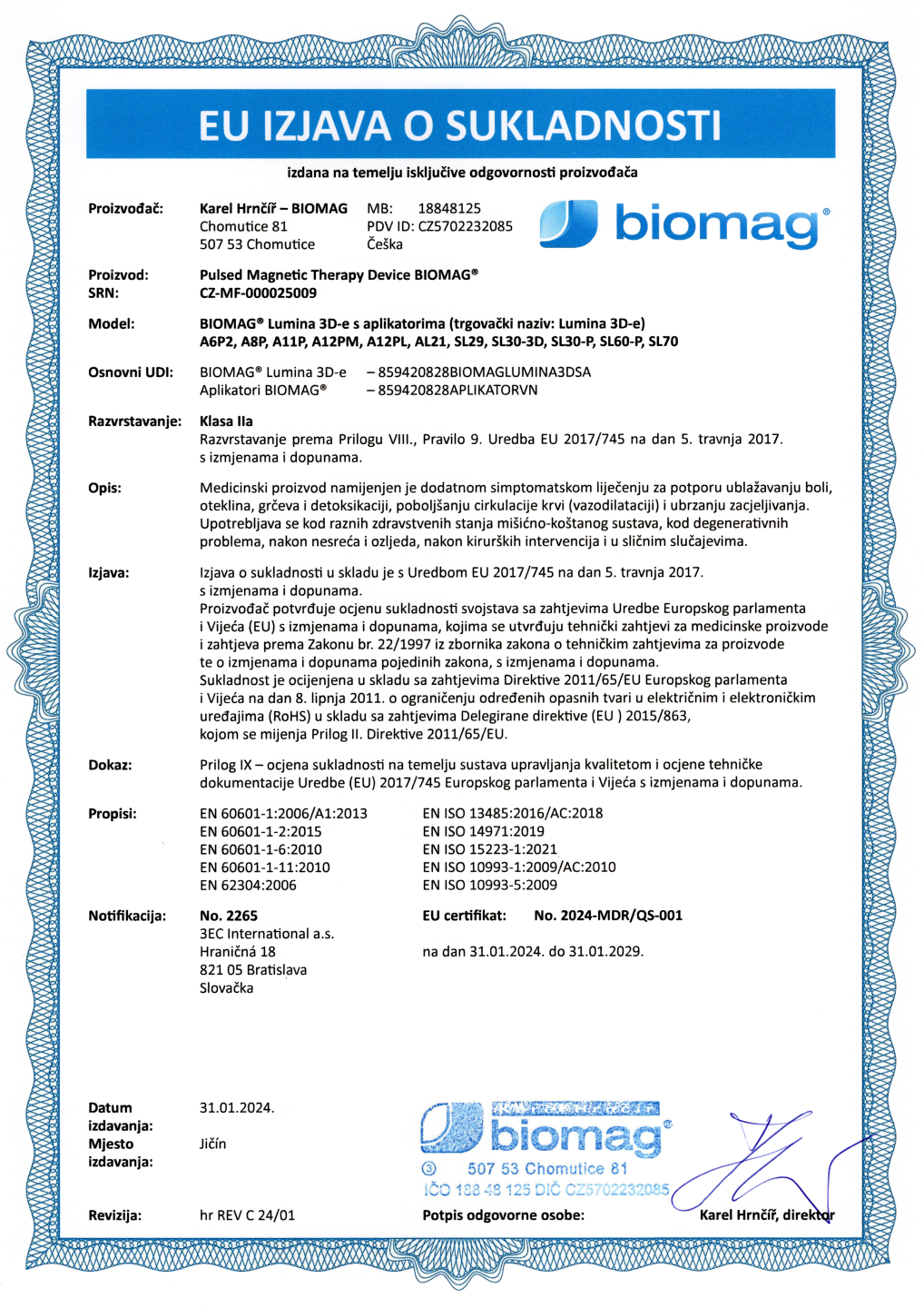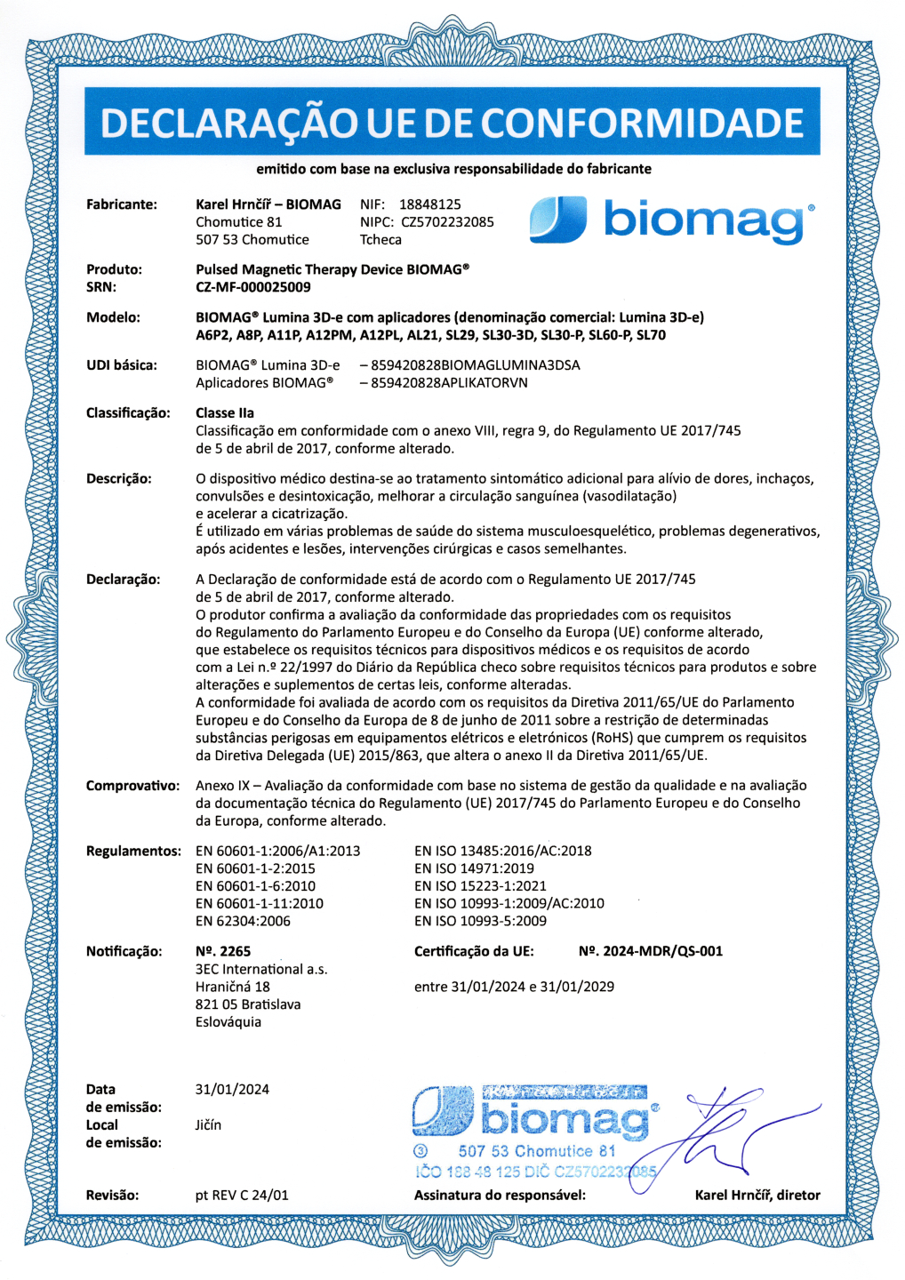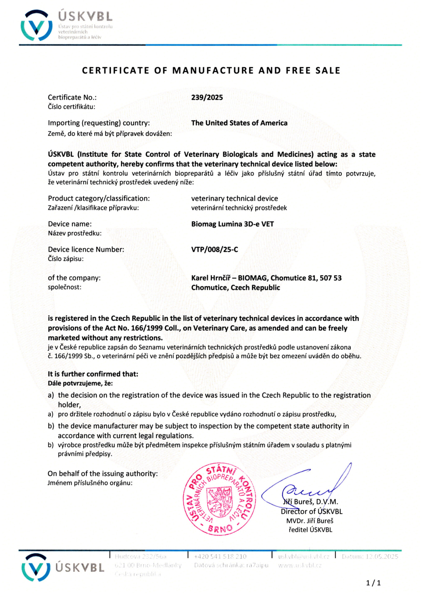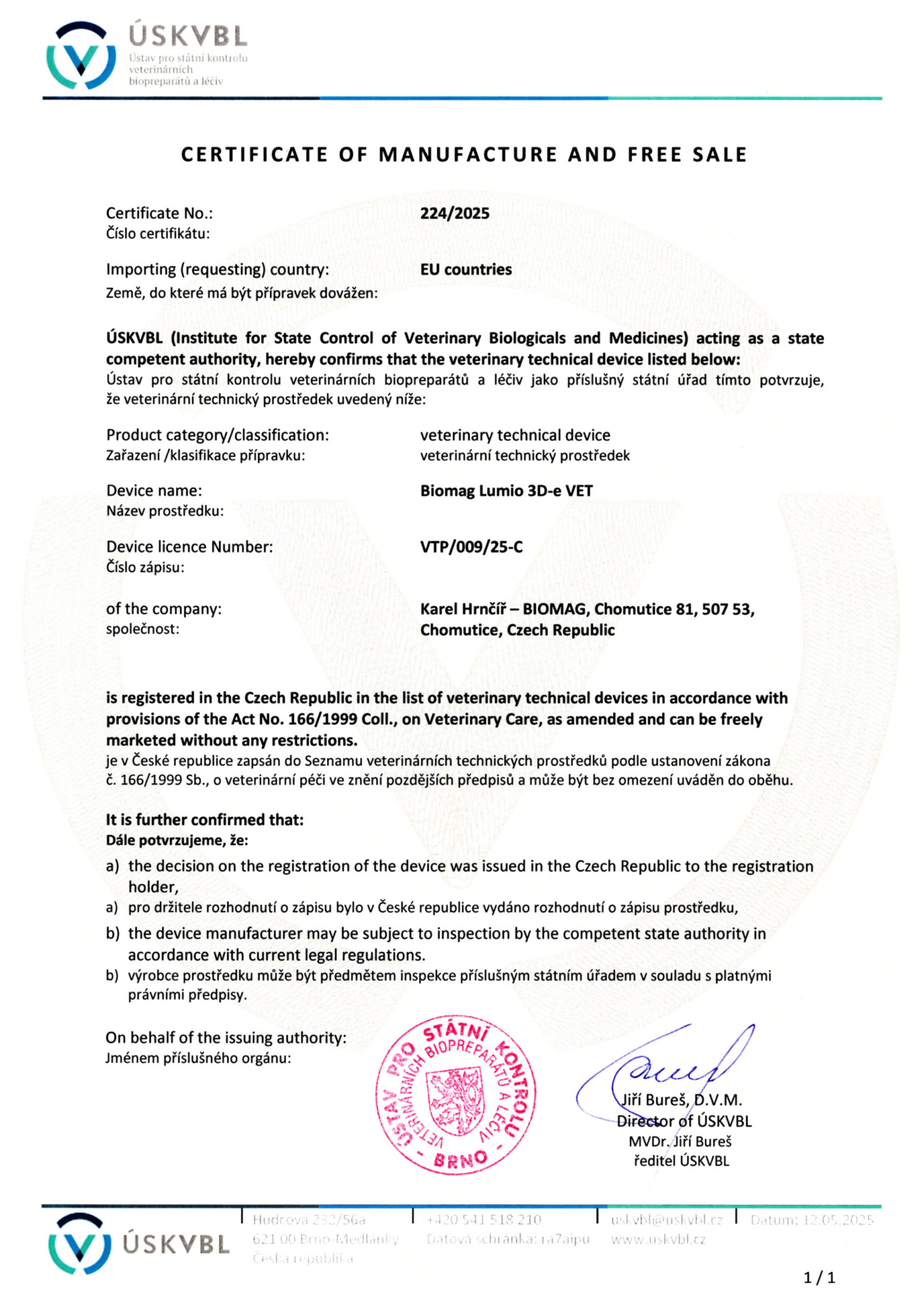 Certificado veterinario - BIOMAG® Lumina 3D-e VET, Lumio 3D-e VET