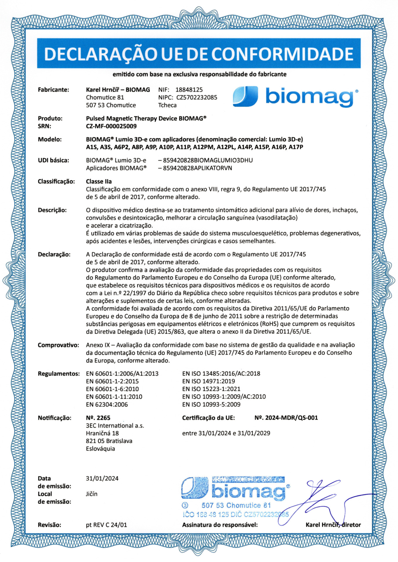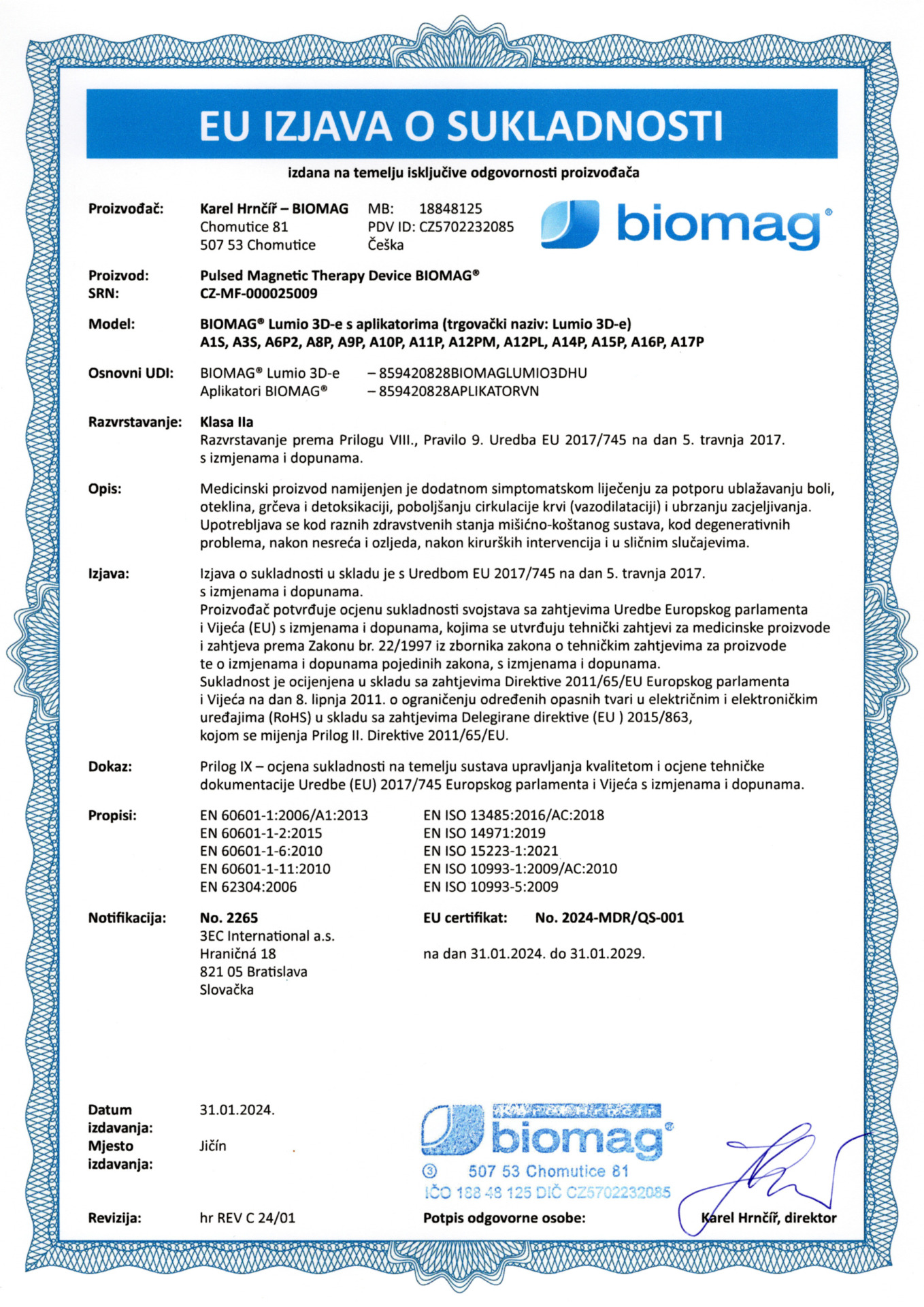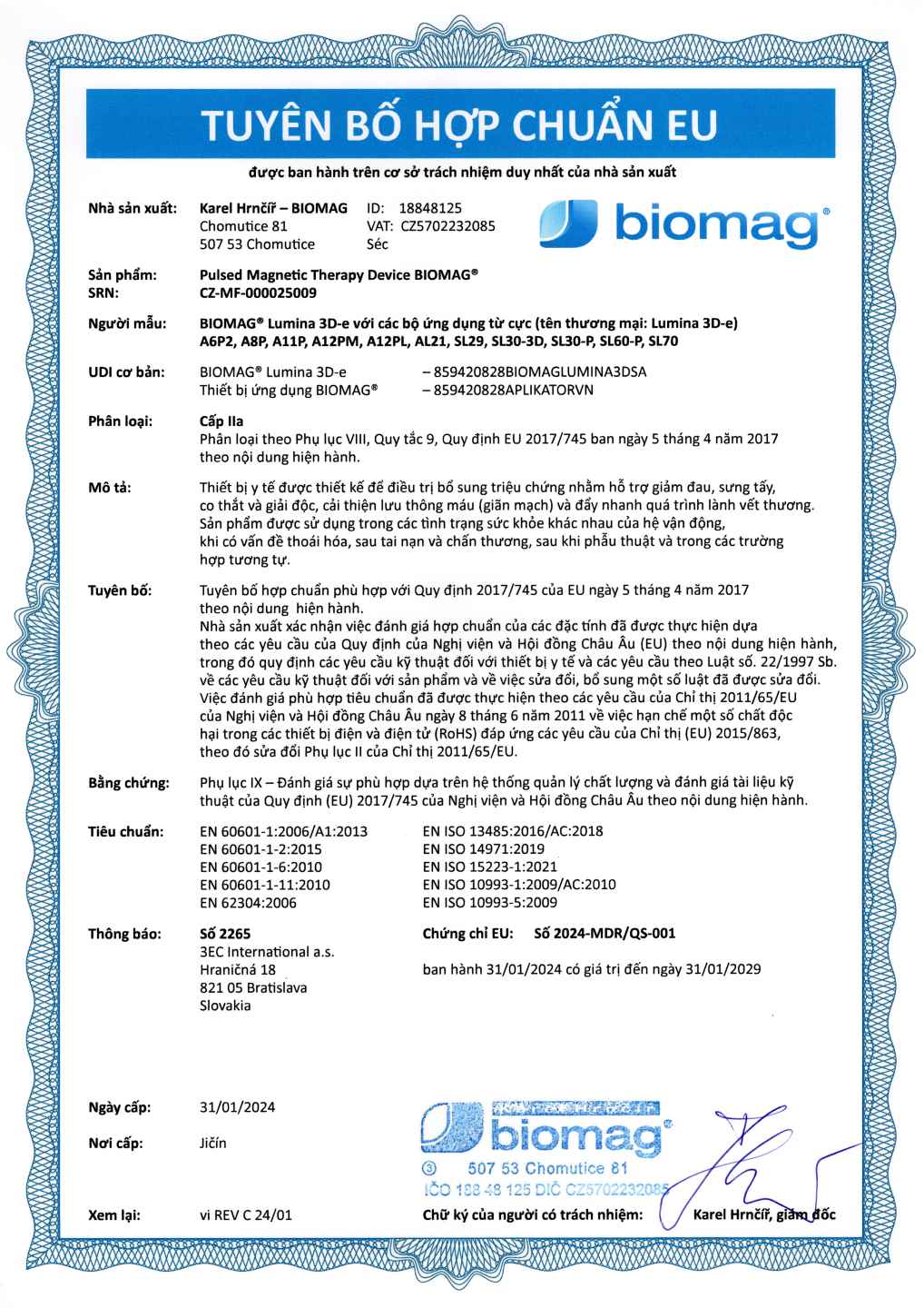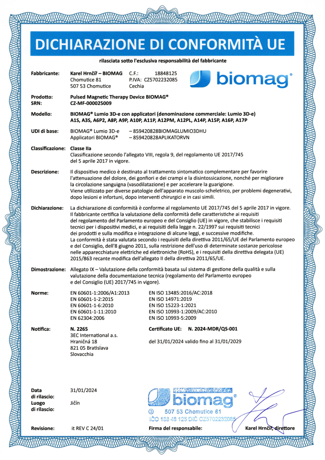Certificado veterinario - BIOMAG® Lumina 3D-e VET, Lumio 3D-e VET