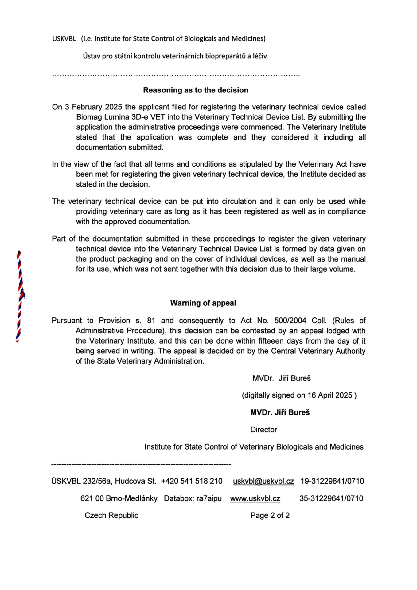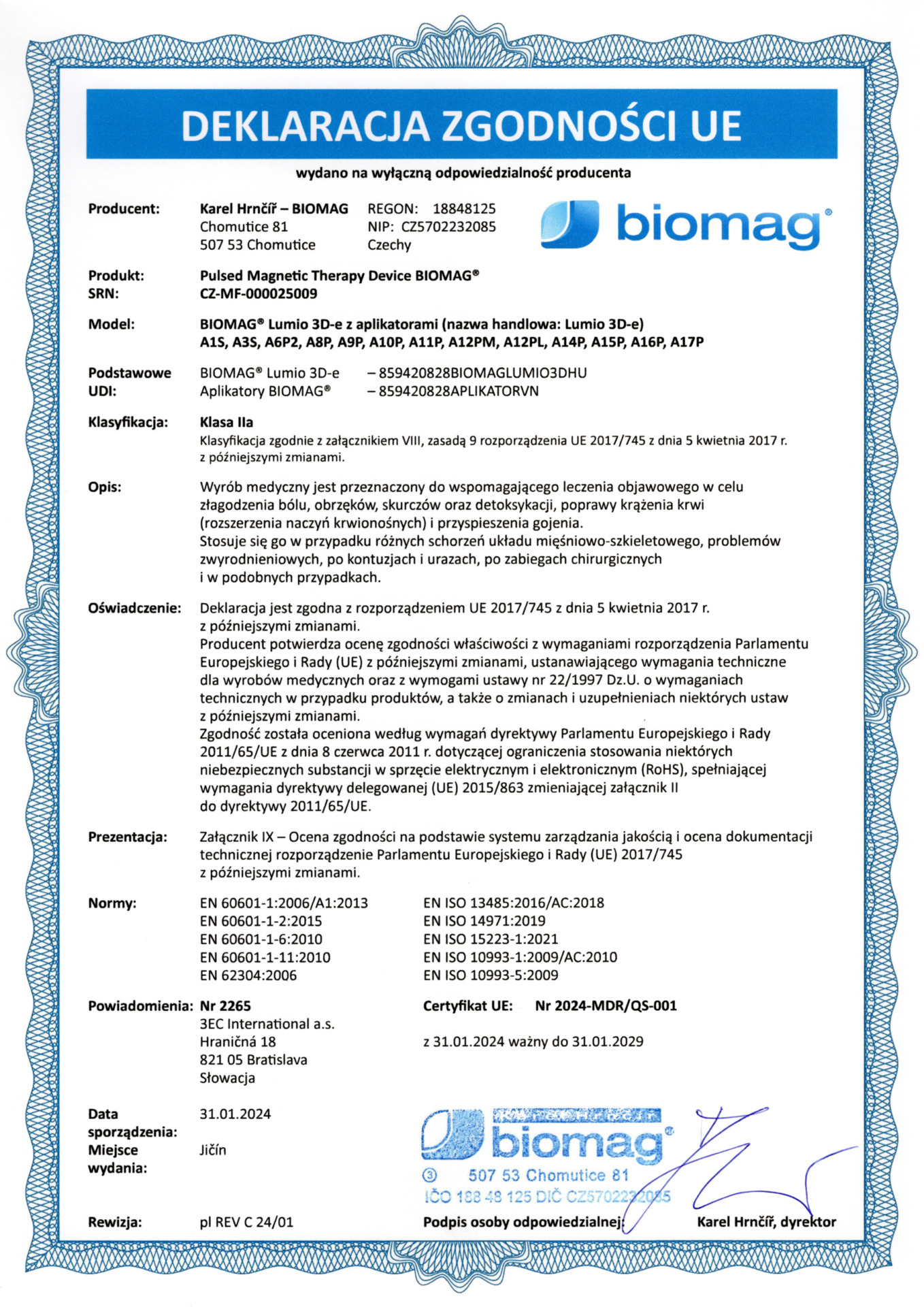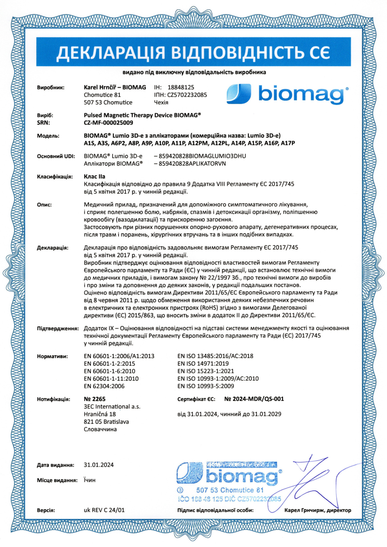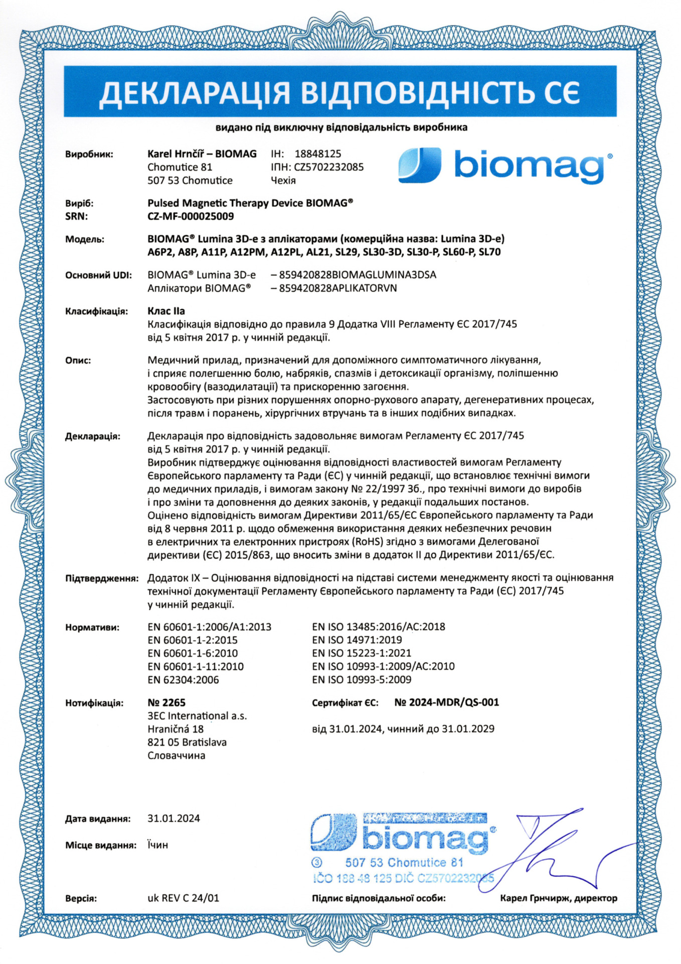 Certificado veterinario - BIOMAG® Lumina 3D-e VET, Lumio 3D-e VET