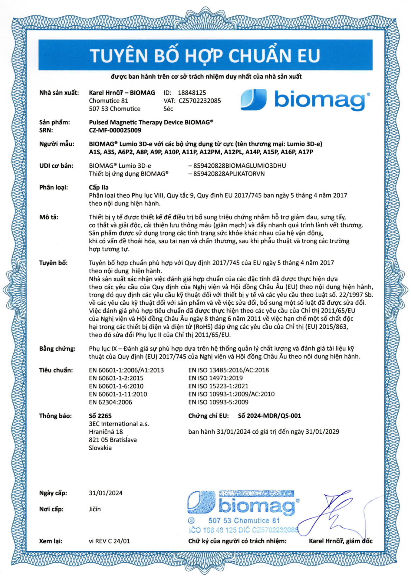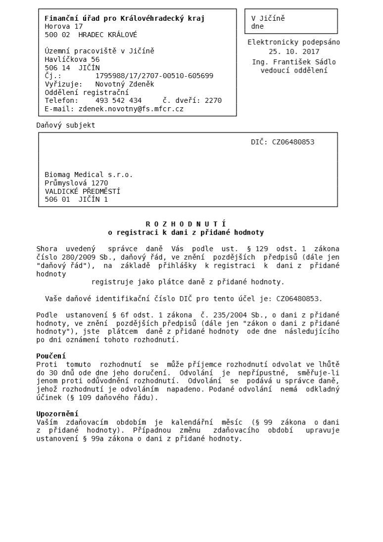 En el Certificado de registro la empresa Biomag Medical s.r.o. confirma que es pagadora de impuesto sobre el valor añadido.