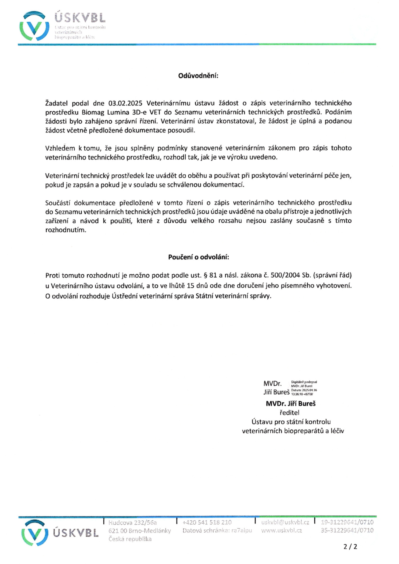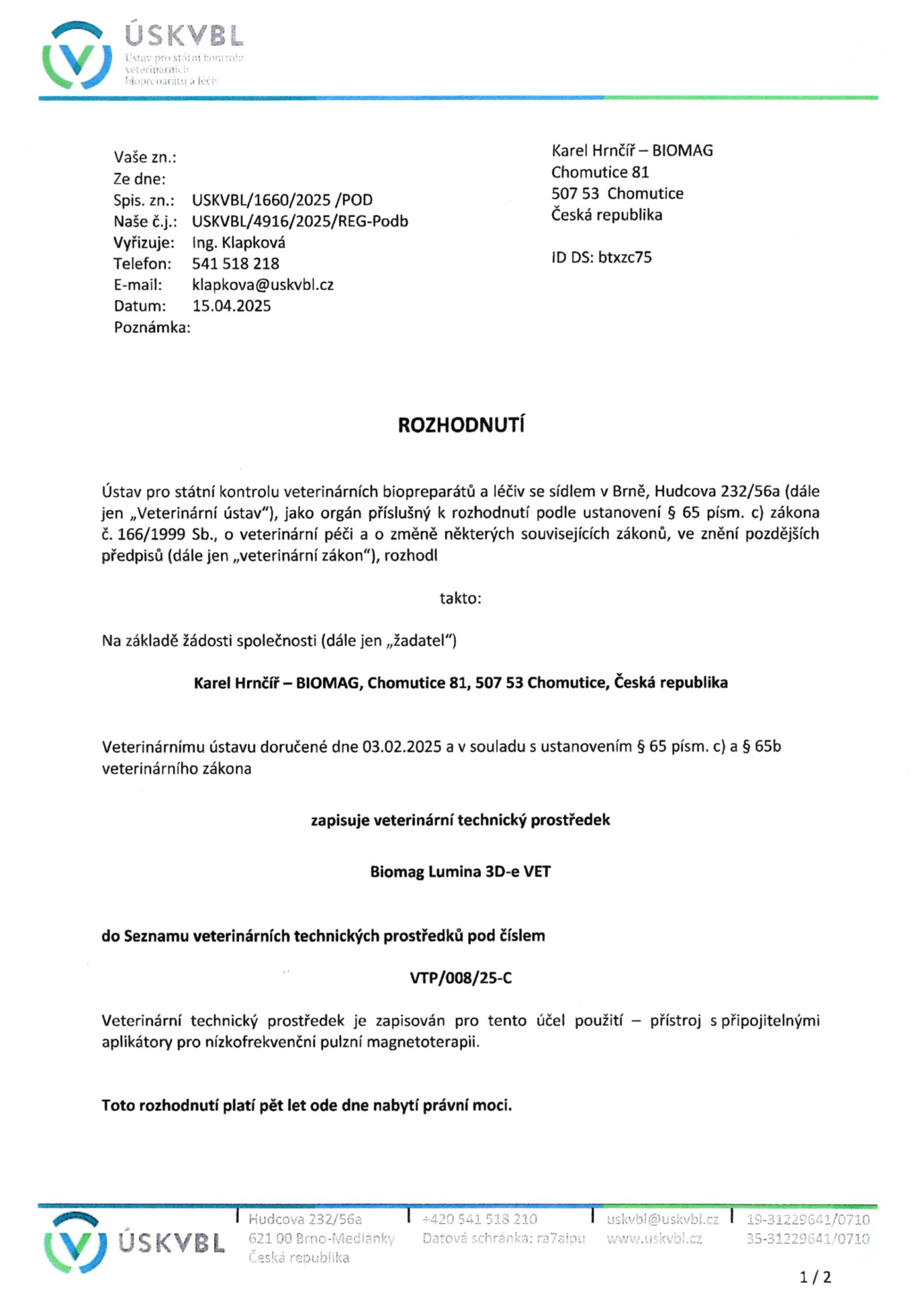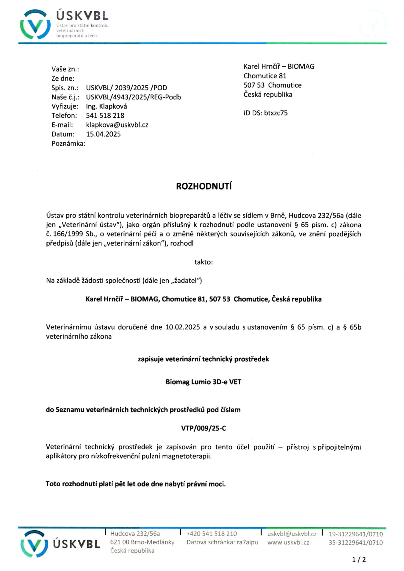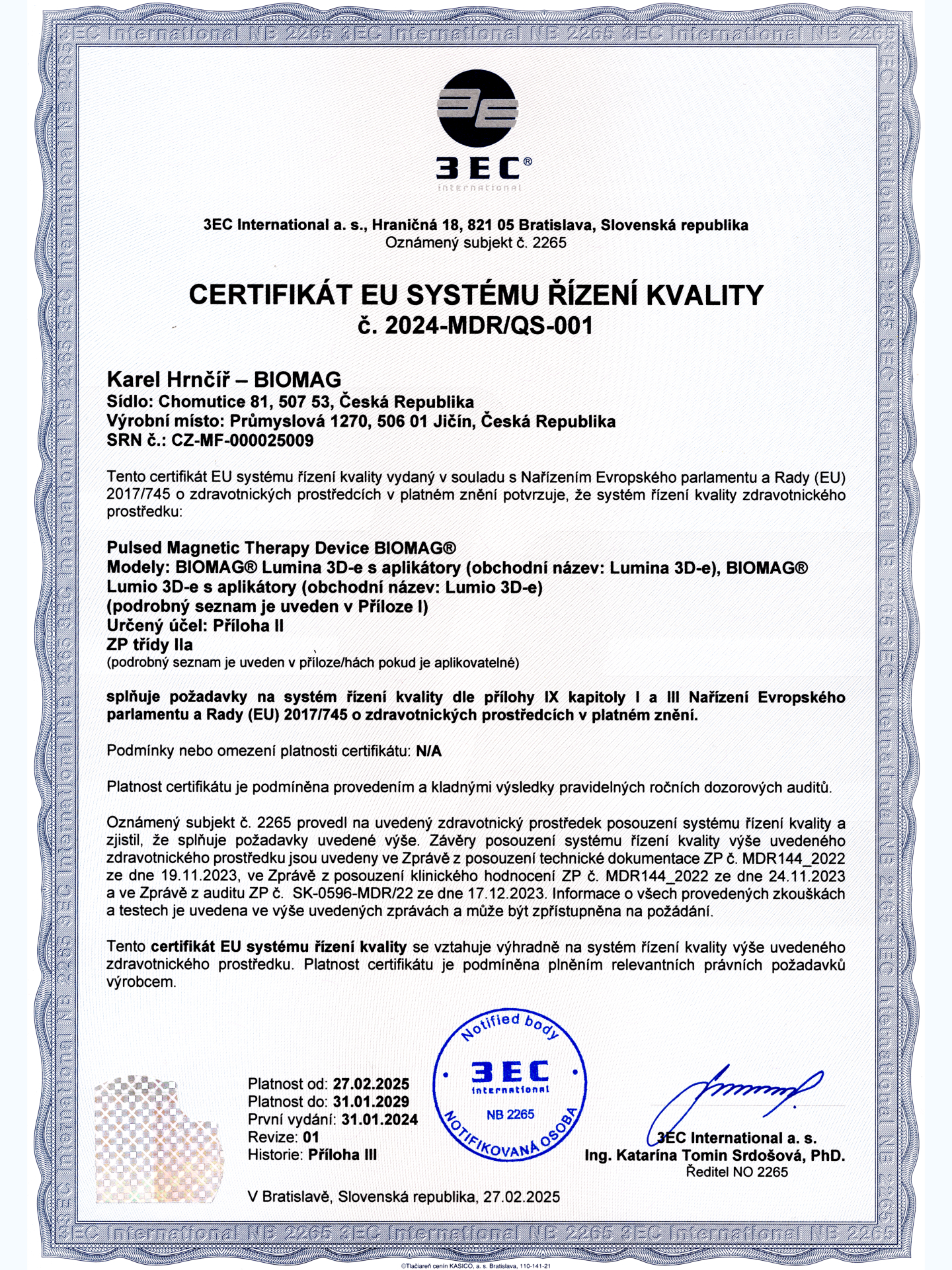 Biomag Medical s.r.o. está inscrita en el registro de operadores económicos (registro EORI) y le fue asignado un identificador único (número EORI – Economic Operators Registration and Identification number). El número EORI sirve como un identificador único para la comunicación con las autoridades aduaneras.