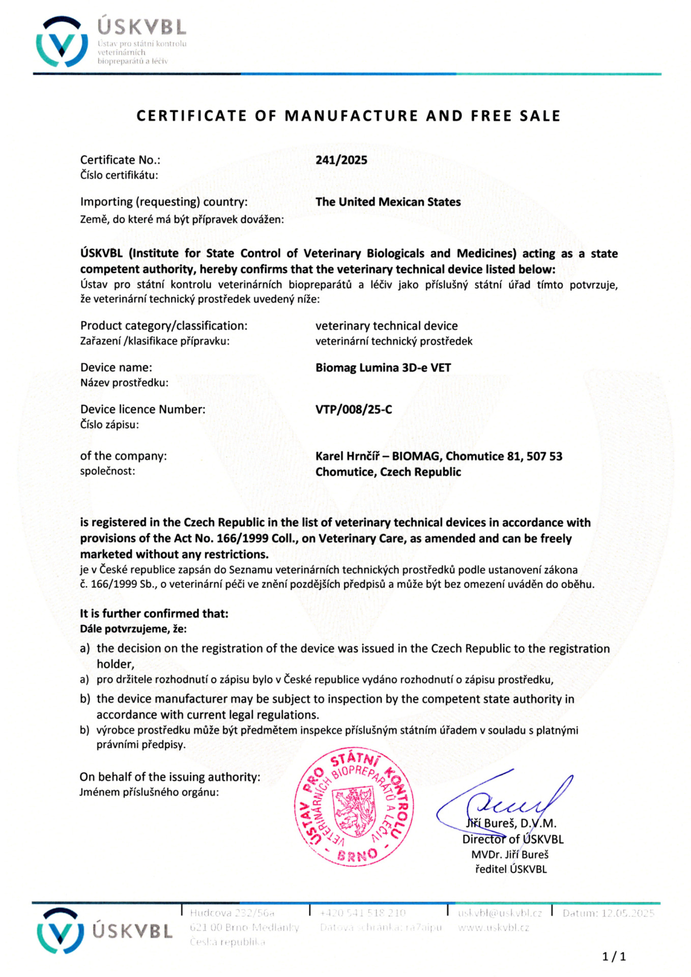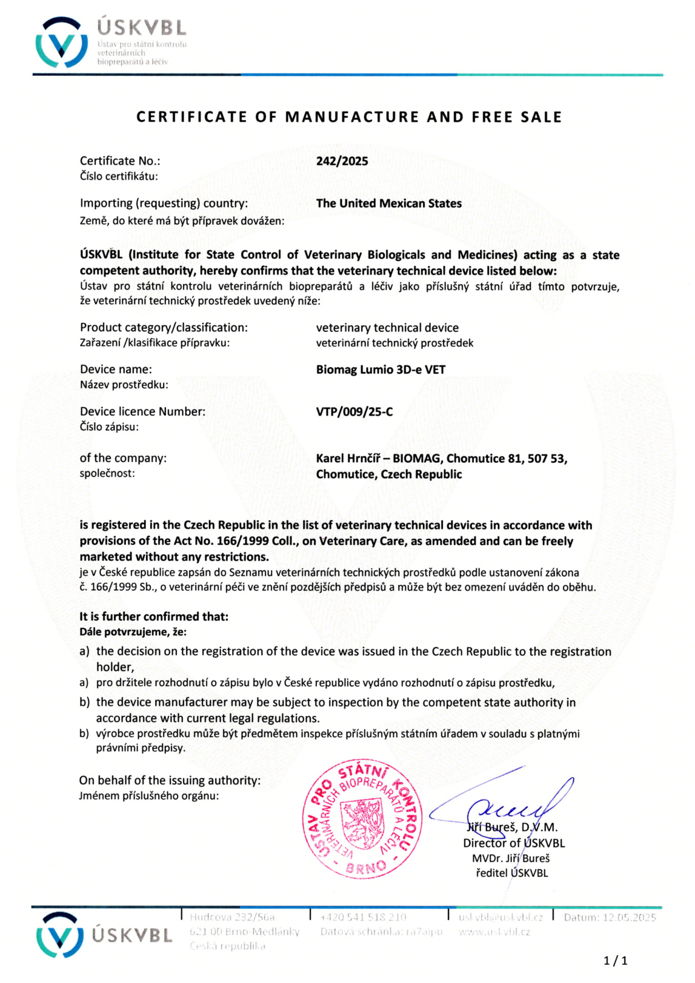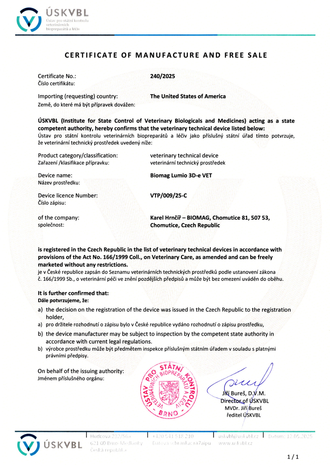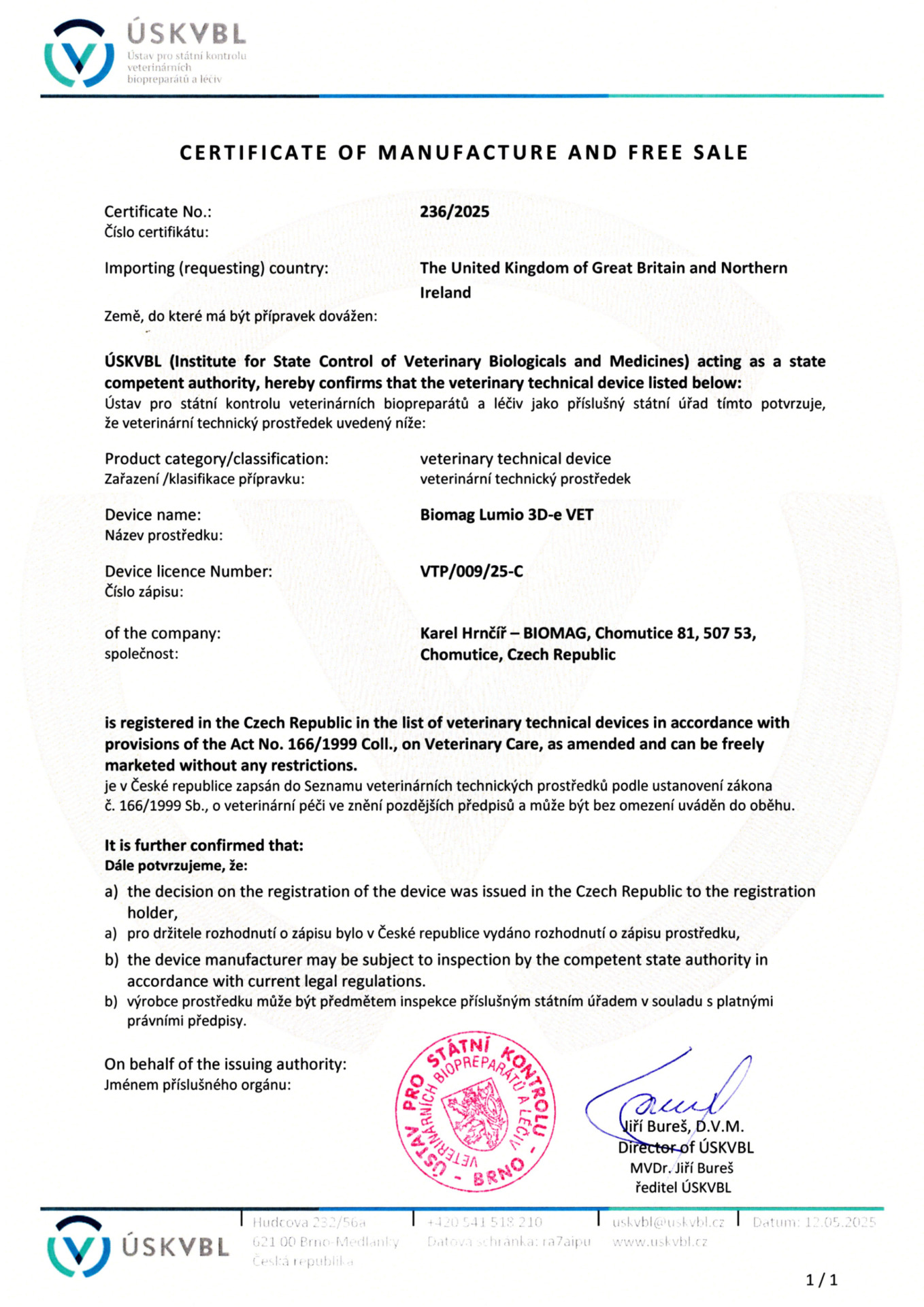 Cerificate of manufacture and free sale – UK – Lumio VET