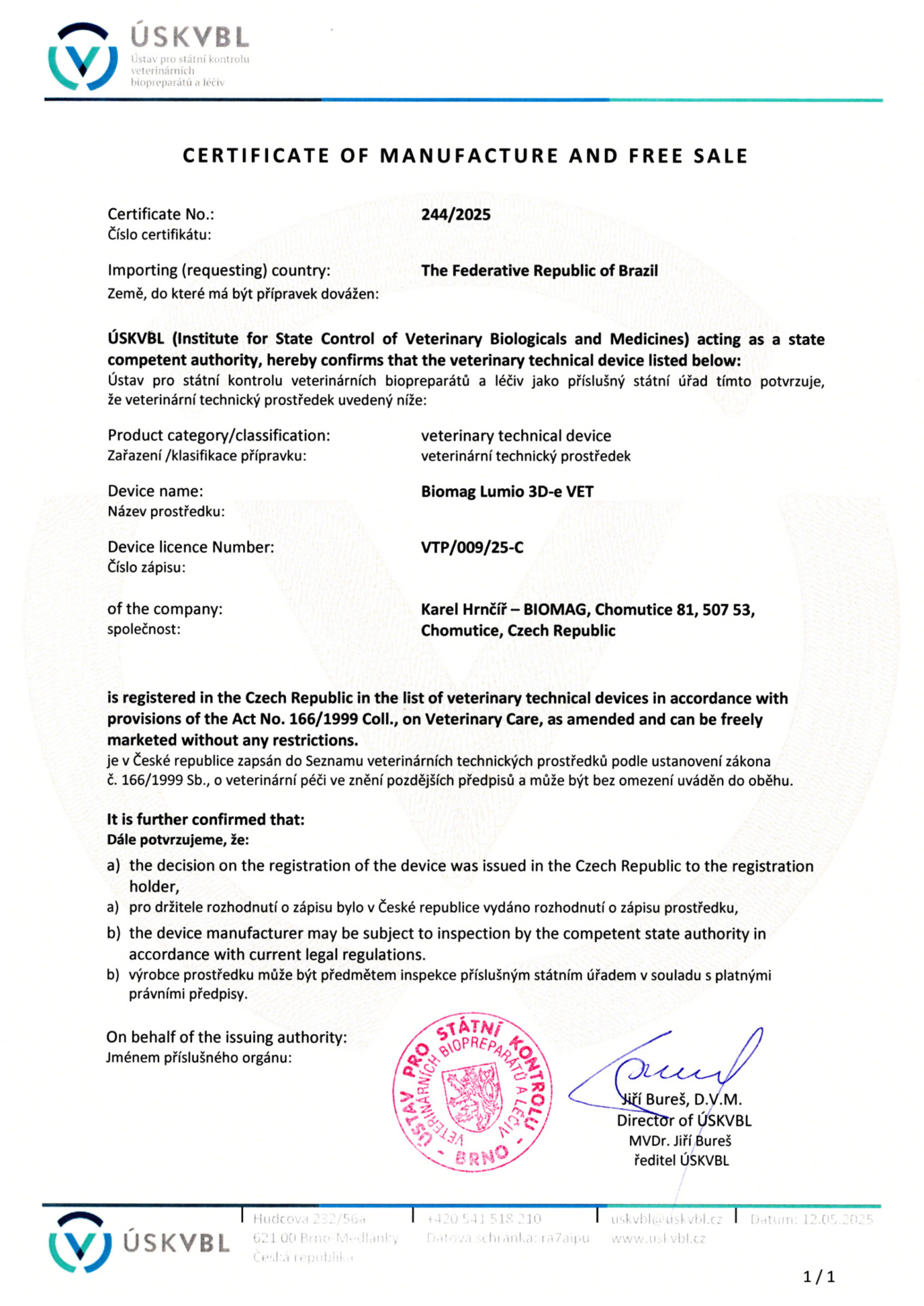Cerificate of manufacture and free sale – Brazil – Lumio VET