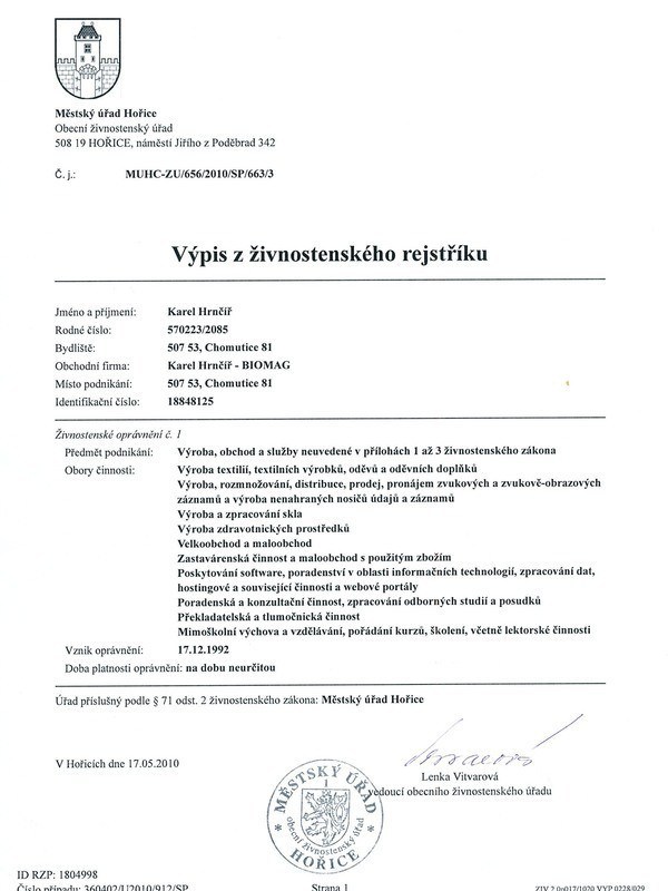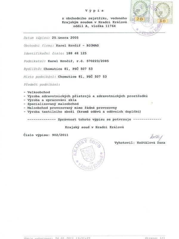 El extracto del registro mercantil demuestra que la empresa Karel Hrnčíř – Biomag es la propietaria de la licencia comercial para la fabricación de dispositivos médicos y para otras actividades.