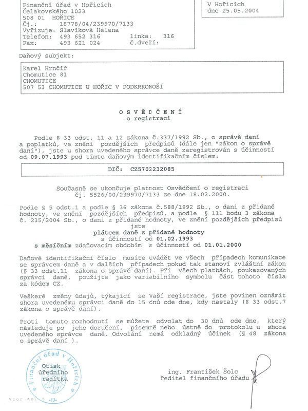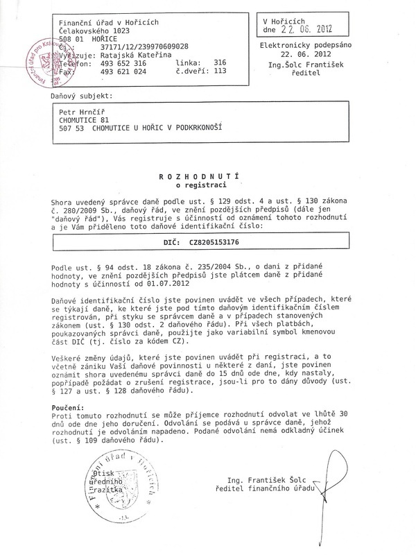El Certificado de registro del pagador de IVA fue emitido por: Oficina financiera en Hořice.