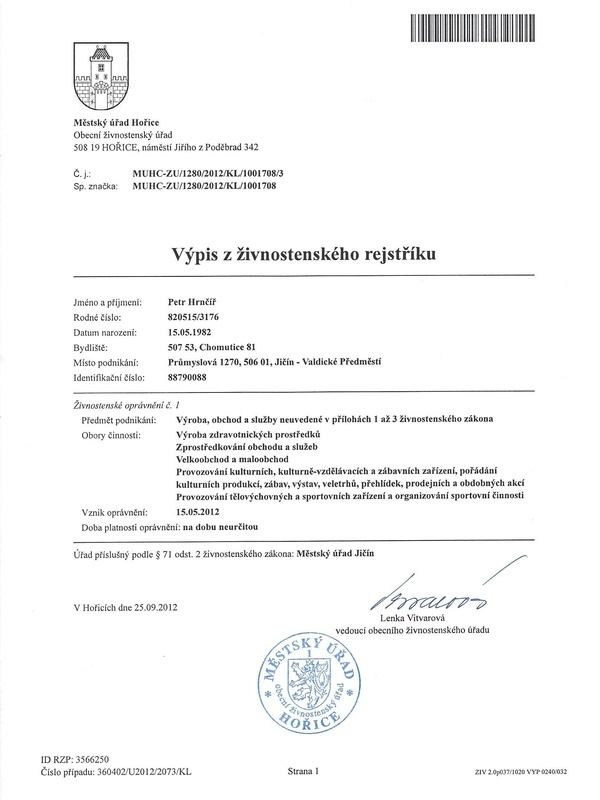 El extracto del registro mercantil demuestra que la empresa Petr Hrnčíř es la propietaria de la licencia comercial para la fabricación de dispositivos médicos, mediación de negocios y servicios, y para otras actividades mencionadas en el extracto.